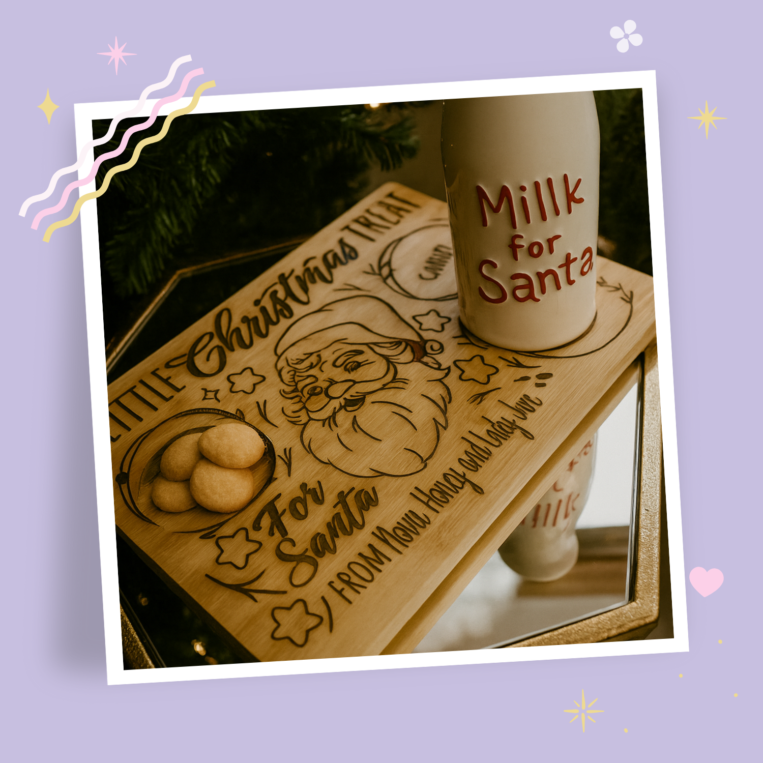 Santa's Treat Tray is a charming way to set the holiday scene on Christmas Eve. This thoughtfully designed tray provides dedicated spaces for milk, cookies, and carrots—everything Santa and his reindeer need for their magical visit. Personalize it with your child's name, a pet's name, or a heartfelt message to make the moment unforgettable. Crafted with attention to detail, this tray transforms a simple tradition into a cherished keepsake that captures the wonder and warmth of the season. Perfect for creating lasting memories year after year.
